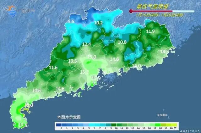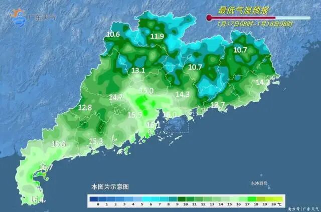 预计,17-19日我省大部晴到多云,早晨有(轻)雾,部分市县有零星小雨,早晚寒凉。北方较强冷空气前锋20日早晨影响粤北,傍晚前后影响中部,20日夜间影响南部沿海,过程平均气温下降幅度:粤北下降7~10℃,中部下降5~7℃,南部沿海下降3~5℃,过程最低气温出现在22日前后,21-23日粤北有大范围5℃以下低温,粤北高海拔山区-4~0℃,有雨夹雪或冻雨(冰冻)。