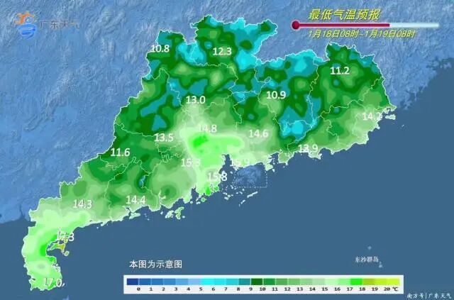 韶关北部、清远北部市县7~10℃,南部沿海市县17~20℃,其余市县13~16℃。
