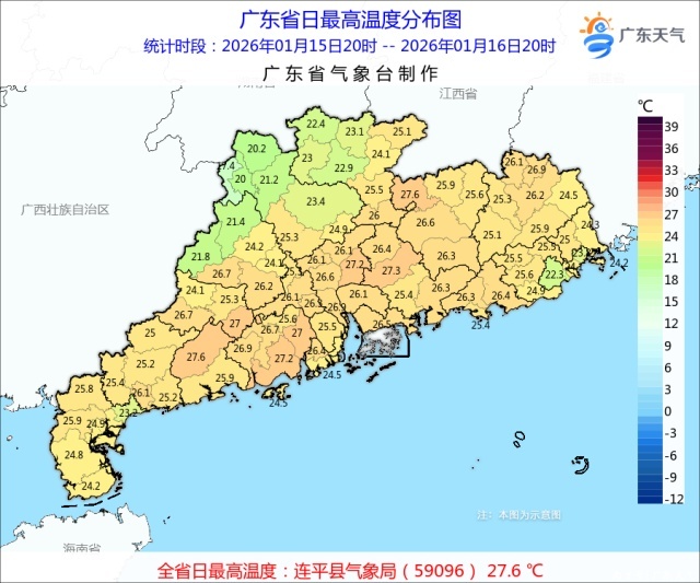 16日白天,粤西、肇庆、云浮、清远、韶关多云,汕头、潮州多云到晴,其余大部晴天。粤西西部、云浮西部、肇庆北部、清远和韶关大部白天最高气温较昨日下降了1~7℃;最高气温具体分布:肇庆北部、清远中北部、韶关西部、汕头和湛江东北部介于17~23℃之间,其余大部介于24~27℃,其中河源连平和阳江阳春录得全省最高气温27.6℃。